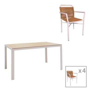 Set de 5 buc masa si scaune de gradina Nares-Pino A aluminiu alb si placaj in nuanta naturala 140x80x72.5 cm